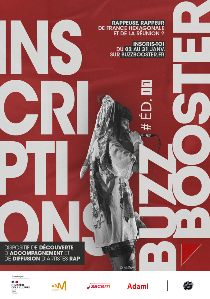 Le dispositif Buzz Booster est un parcours d’accompagnement pensé pour valoriser les esthétiques rap et favoriser la professionnalisation d’artistes émergent·e·s. Les candidatures sont ouvertes pour tenter de remporter une tournée nationale, une bourse de 15000€ pour ta musique, une session studio et un accompagnement sur mesure de 18 mois avec le réseau Buzz Booster.