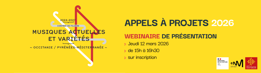 La Drac Occitanie, le Centre National de la Musique, la Région Occitanie / Pyrénées-Méditerranée, Octopus, fédération des musiques actuelles en Occitanie, et l’Agence Unique Occitanie Culture vous invitent au webinaire de présentation des appels à projets : Aide aux projets de coopération professionnelle et Aide à la structuration et à la consolidation des entreprises de production indépendantes. Le dispositif d’accompagnement Transfert de Savoir-Faire (tutorat-mentorat) porté par le GE-OPEP en Occitanie sera également présenté.