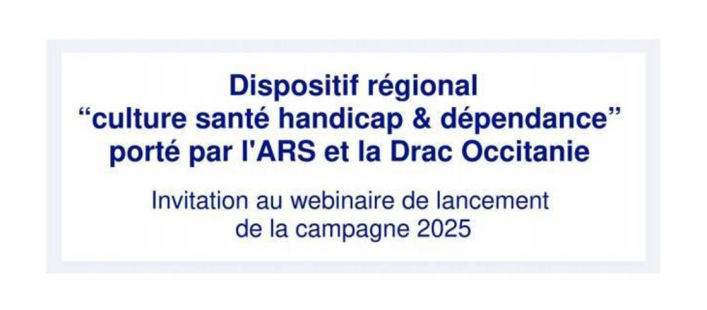 La Direction régionale des affaires culturelles et l’Agence régionale de santé d’Occitanie vous invitent à un webinaire d’information et d’échanges à propos du dispositif régional « Culture santé handicap & dépendance », le jeudi 17 octobre 2024, de 10 h à 11 h.