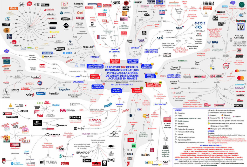 Cette cartographie vise à illustrer le poids des dix plus grands opérateurs privés actifs dans le secteur des musiques actuelles en France. Réalisée par Matthieu Barreira en partenariat avec le SMA – Syndicat des musiques actuelles, cette initiative s’inscrit dans le contexte de la campagne « Vous n’êtes pas là par hasard » et d’un plaidoyer pour des festivals indépendants.